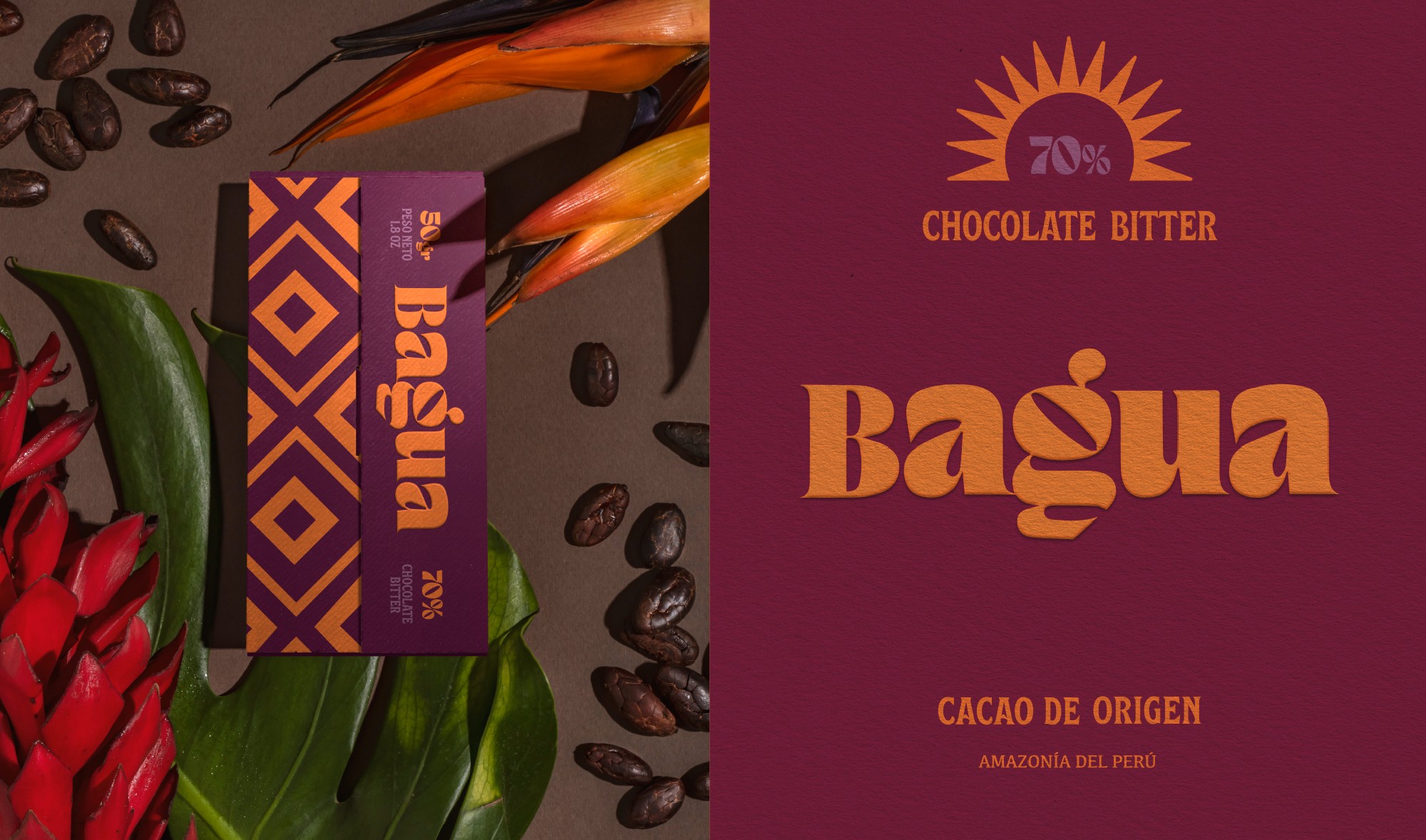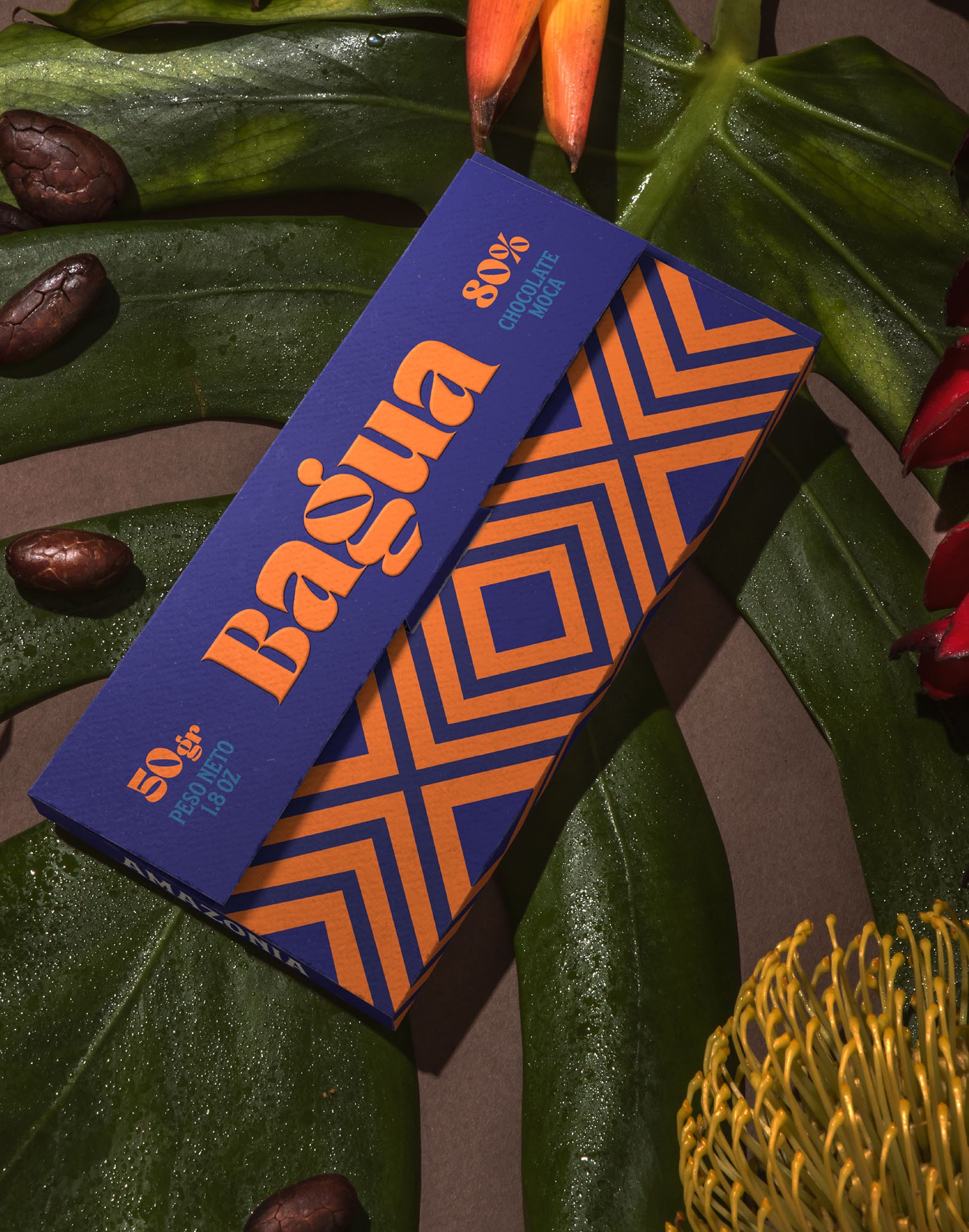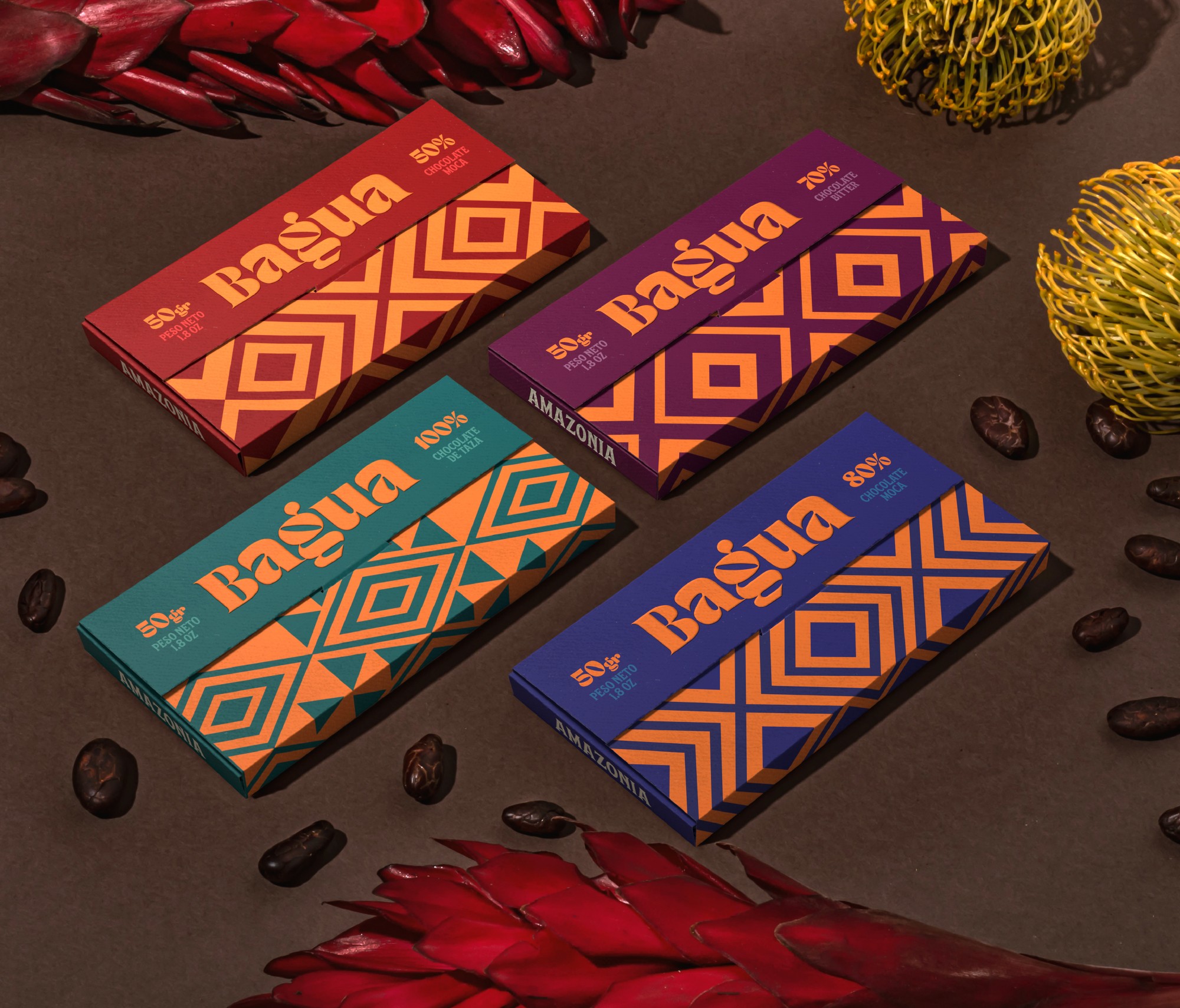 An identity that not only represents the chocolate that comes from the super trees of the Peruvian rainforest, but also a system that conveys the story and values of a community. Inspired by the land and its people, the design incorporates geometric patterns drawn from Awajún art, reflecting the territory and the hands behind its harvest. The vibrant color evokes the sun that shines over Bagua throughout the year, while the curved typography is inspired by the river the community travels to reach their land—an essential path connecting people, culture, and place. Together, these elements create a contemporary yet human identity that honors the families and traditions behind the cooperative.