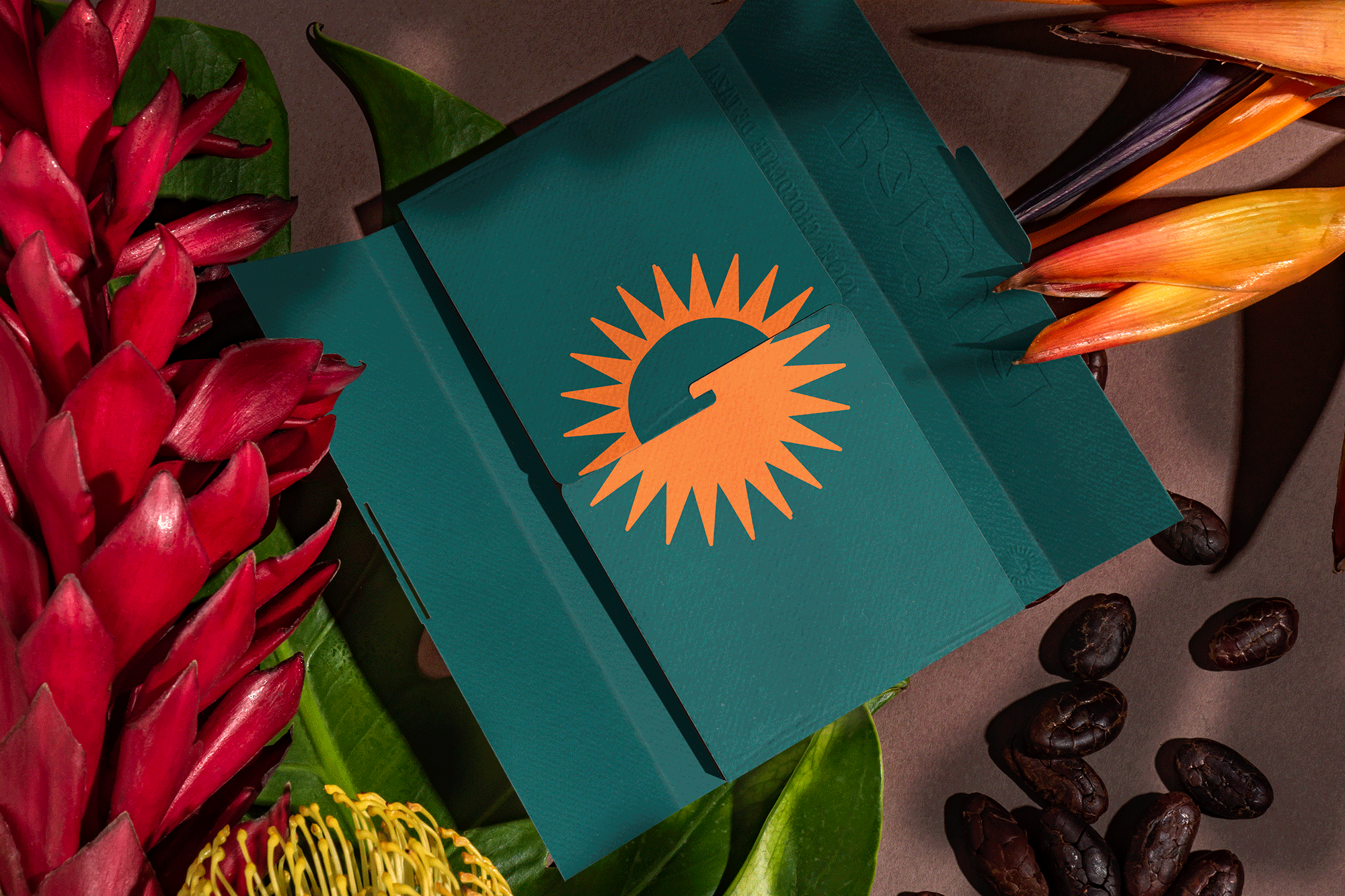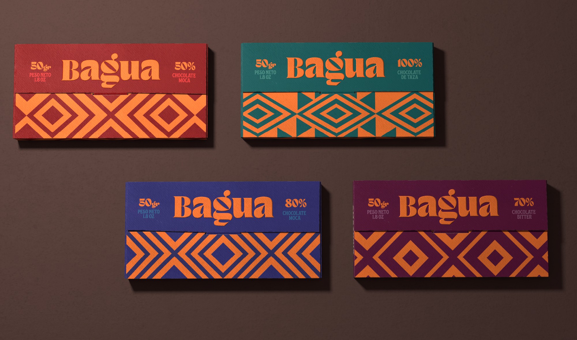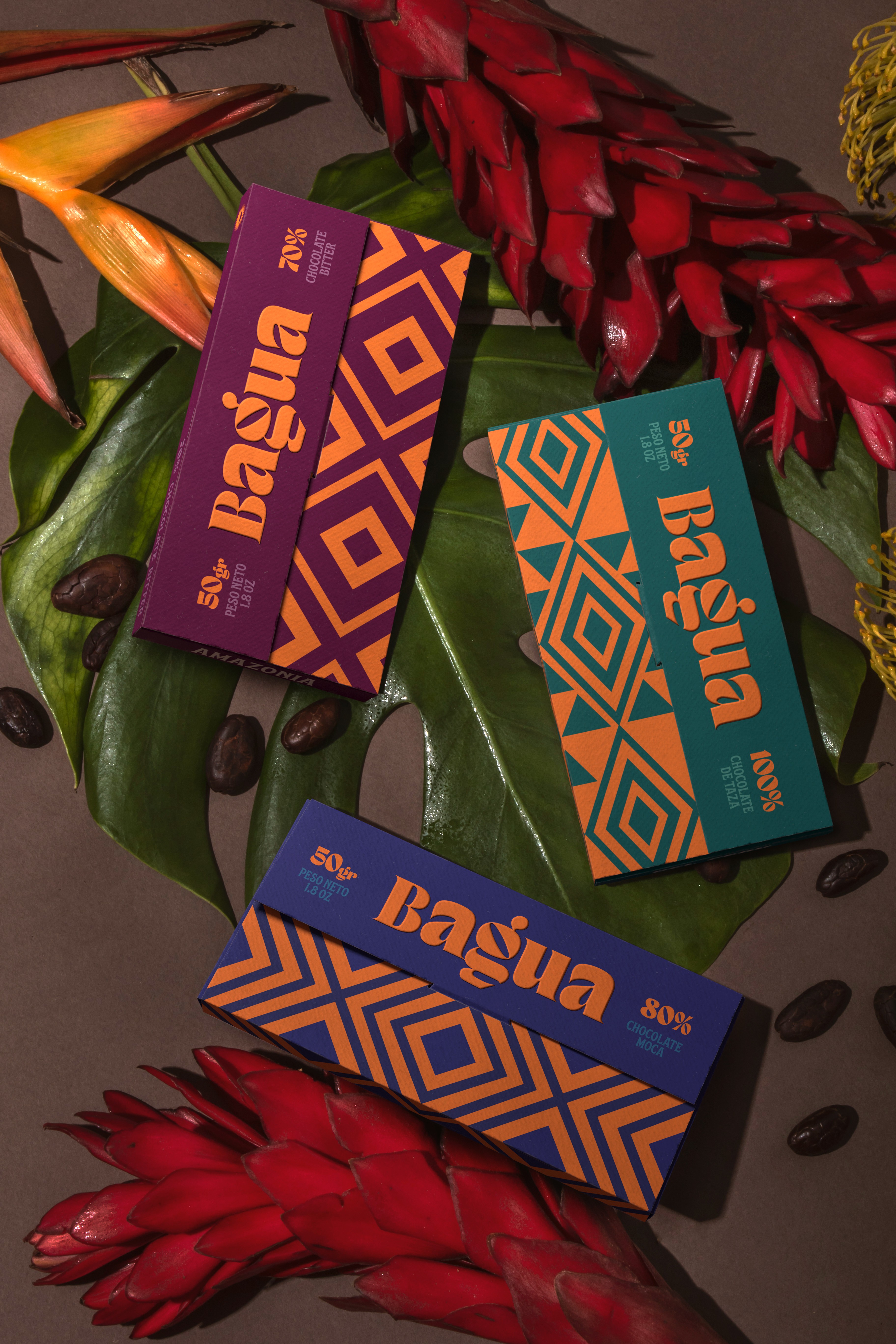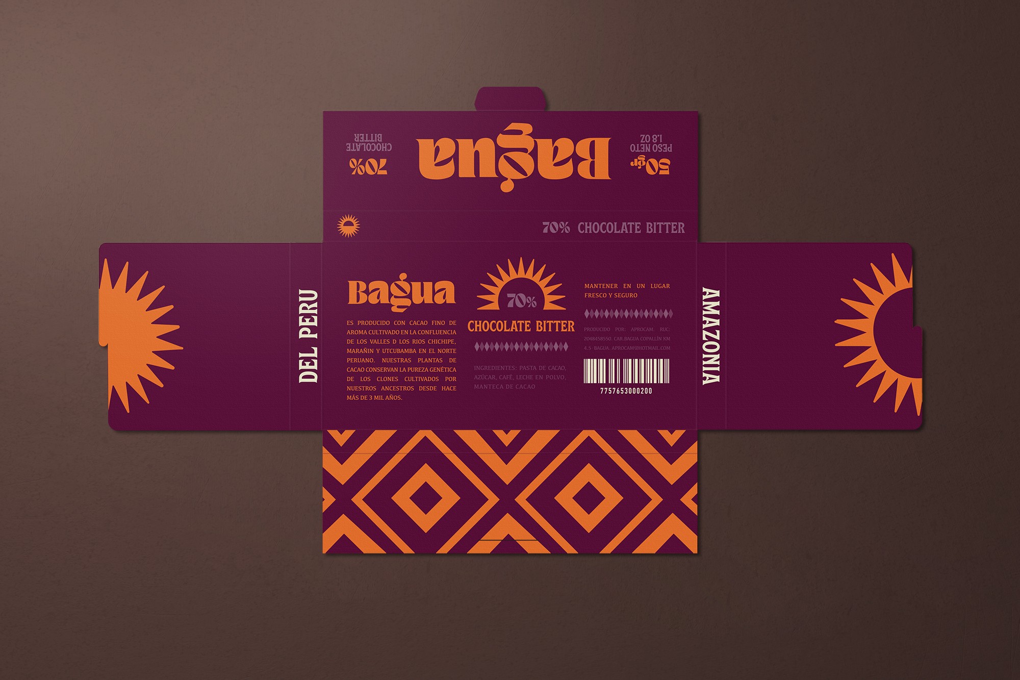An identity that not only represents the chocolate that comes from the super trees of the Peruvian rainforest, but also a system that conveys the story and values of a community. Inspired by the land and its people, the design incorporates geometric patterns drawn from Awajún art, reflecting the territory and the hands behind its harvest. The vibrant color evokes the sun that shines over Bagua throughout the year, while the curved typography is inspired by the river the community travels to reach their land—an essential path connecting people, culture, and place. Together, these elements create a contemporary yet human identity that honors the families and traditions behind the cooperative.