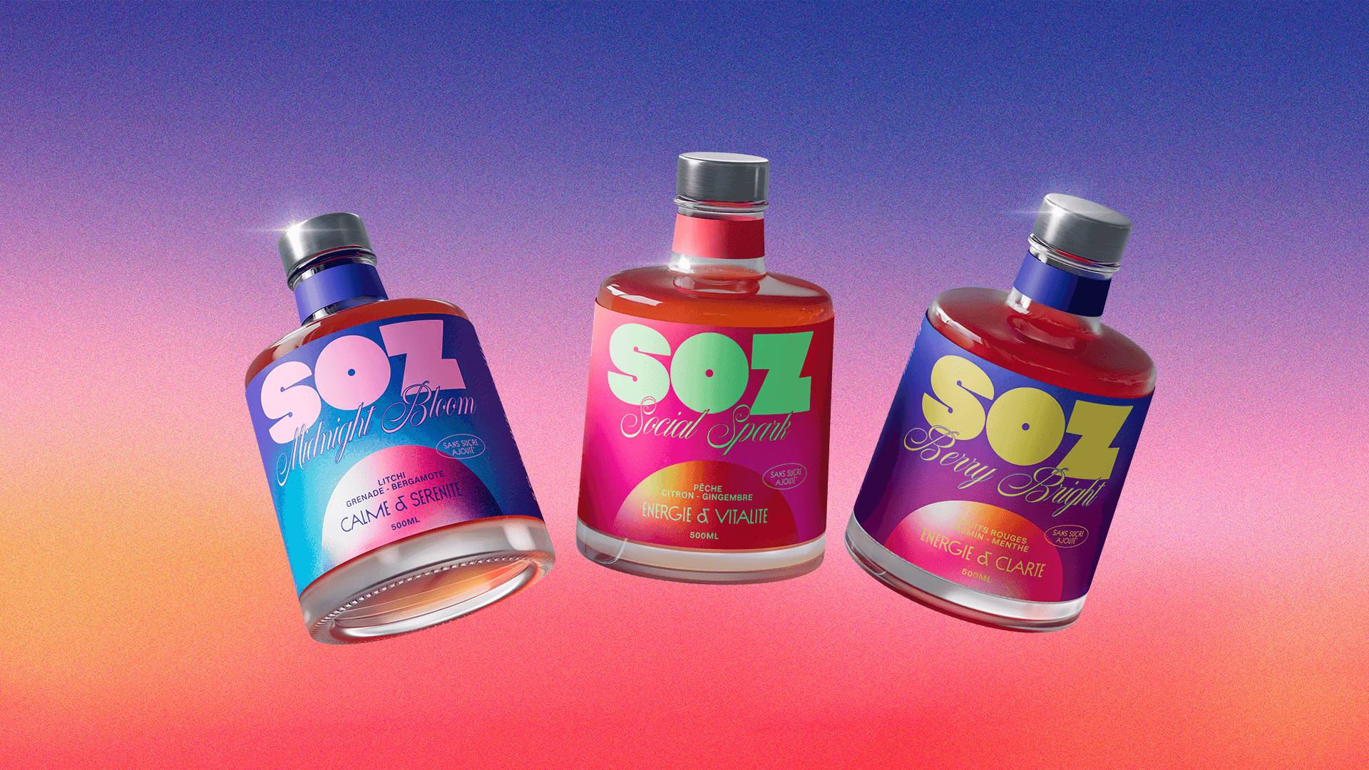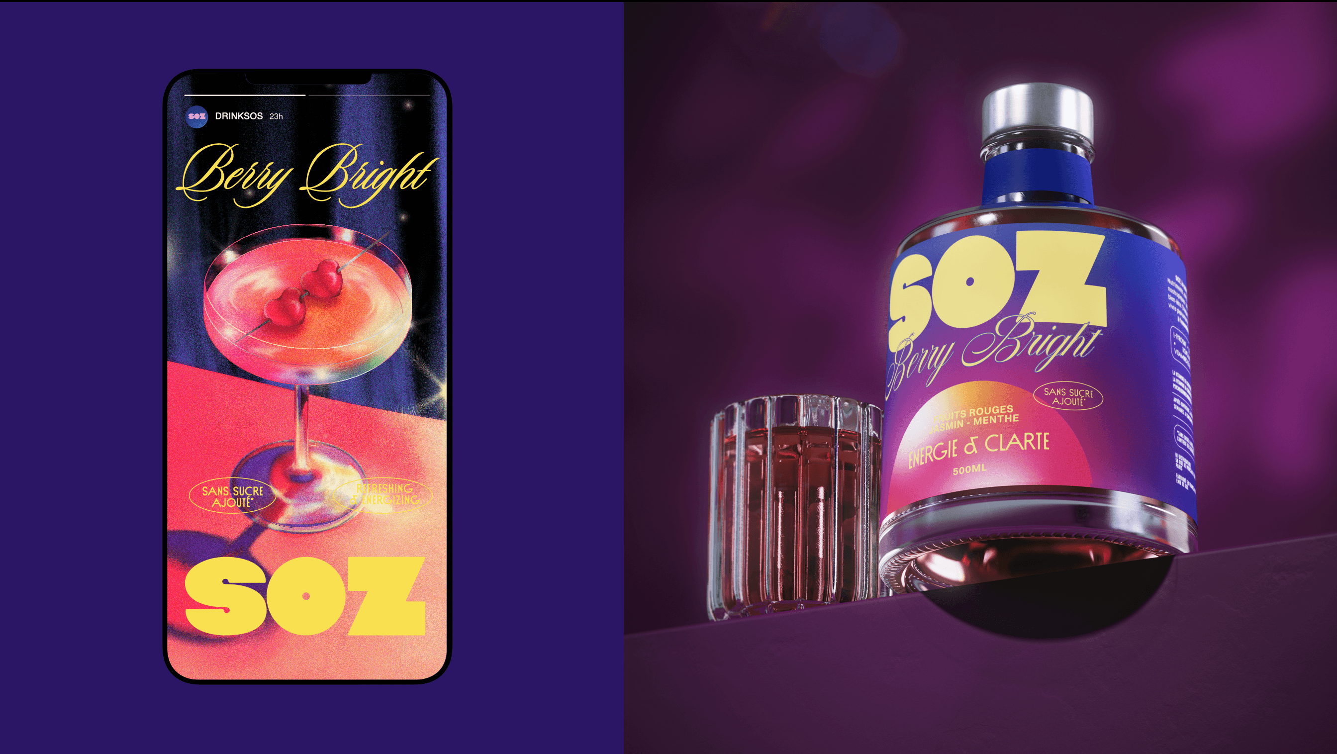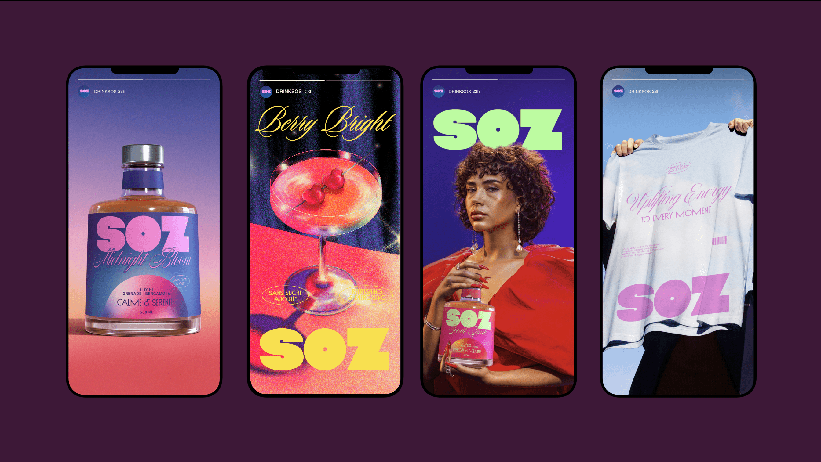 SOZ is a natural mocktail brand born from the idea that the party doesn’t stop just because alcohol does. Challenging the quiet codes of traditional wellness brands, SOZ embraces nightlife, energy, and self-expression. Inspired by Miami Vice and disco culture, the identity captures a bold, vibrant, and unforgettable spirit — proving that natural can be fresh, but also loud, confident, and made for a new generation that celebrates on its own terms.